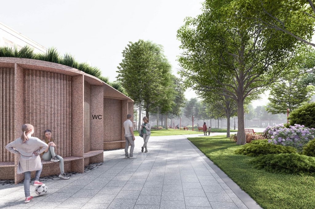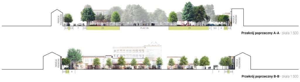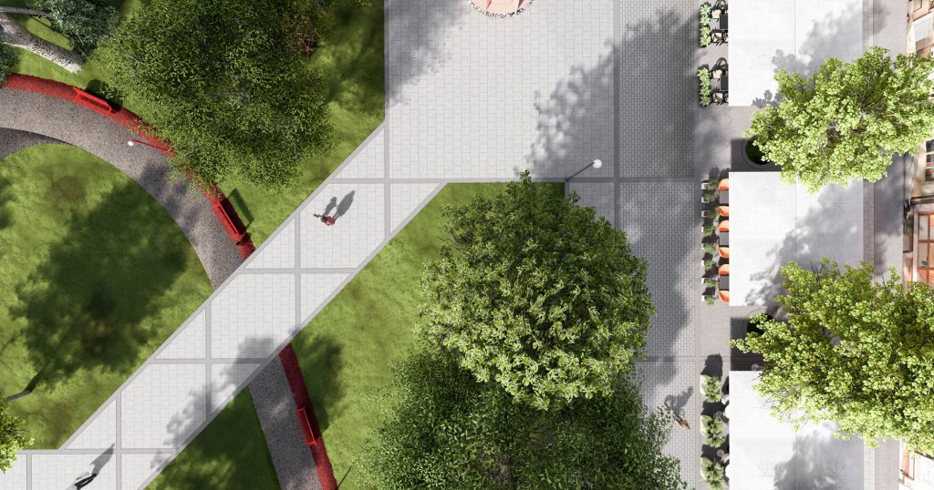 Jedna przestrzeń – płynne przenikanie się światów. Choć oba światy – strukturalna geometria rynku i organiczny charakter zieleni – różnią się w formie, projekt zakłada ich integrację i przenikanie się. Strefy te nie są od siebie odcięte – między nimi znajdują się otwarte przejścia, a także elastyczne rozwiązania umożliwiające ich współdziałanie. Dzięki temu rynek, jako całość, pozostaje miejscem dynamicznym, ale jednocześnie przyjaznym i odpornym na codzienny zgiełk miasta.