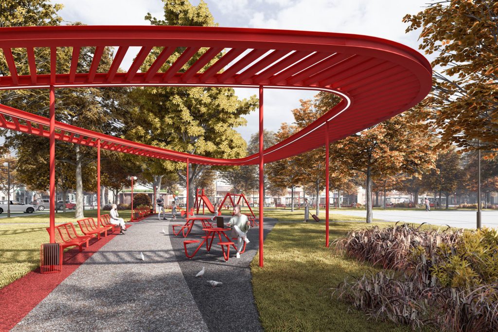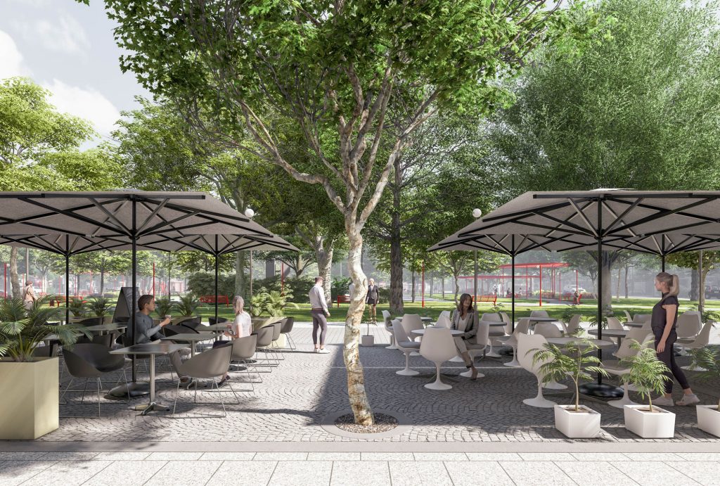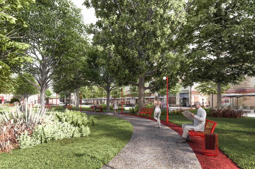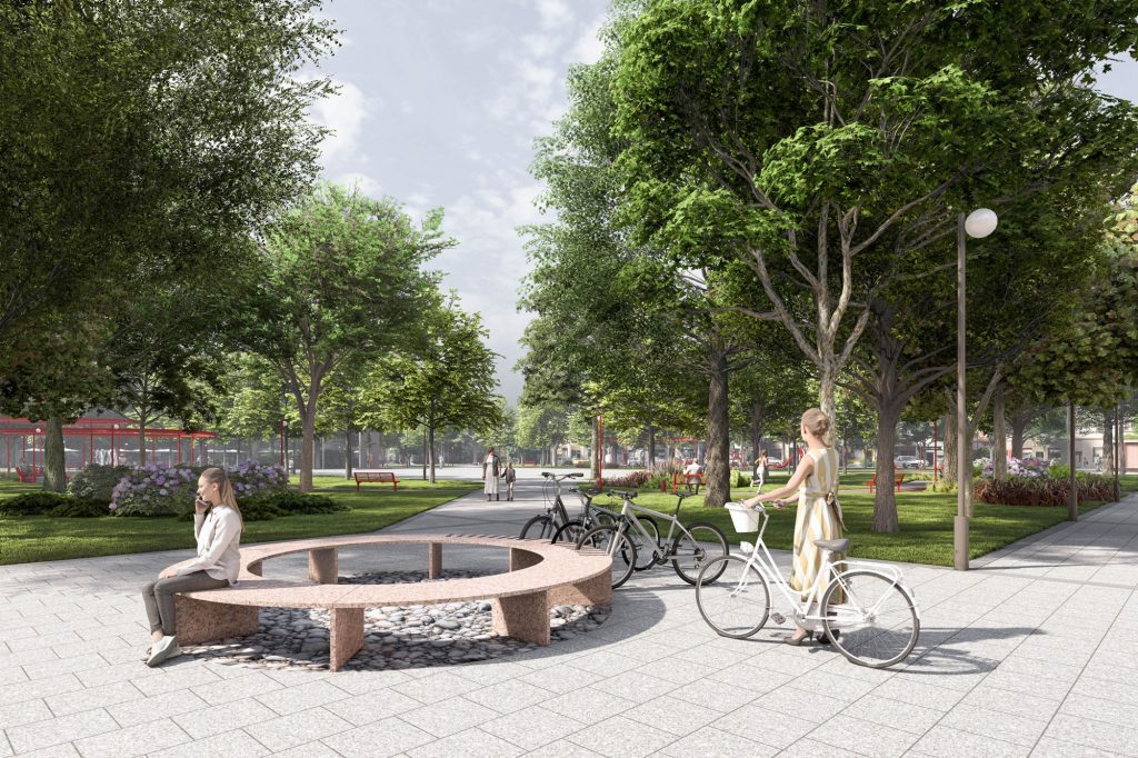 Świat drugi – zielony obwarzanek. Rynek otacza pas zieleni parkowej, który łagodzi miejski charakter centralnej przestrzeni i stanowi naturalne zaproszenie do odpoczynku. To miejsce pełne cienistych, żwirowych alejek, czerwonych ławek oraz pergoli, zlokalizowanych nad kameralnymi placykami. Placyki te uzupełniają ofertę funkcjonalną o strefę zabaw dla dzieci oraz fontannę tworzącą wyjątkowy mikroklimat pod koronami drzew. Zielona strefa stanowi bufor pomiędzy wielofunkcyjnym placem, a otaczającą go tętniącą życiem zabudową i komunikacją sprzyjając relaksowi i integracji mieszkańców.