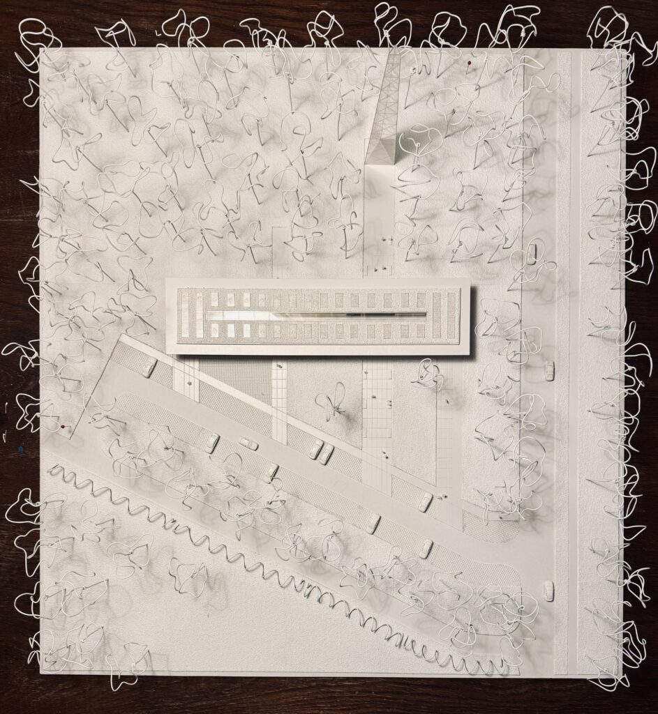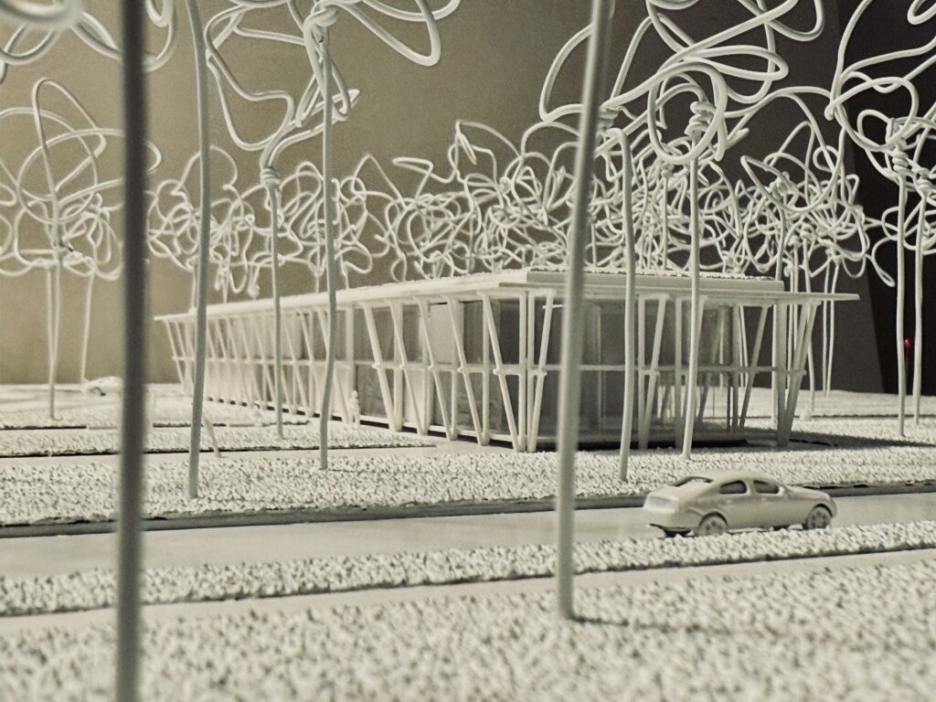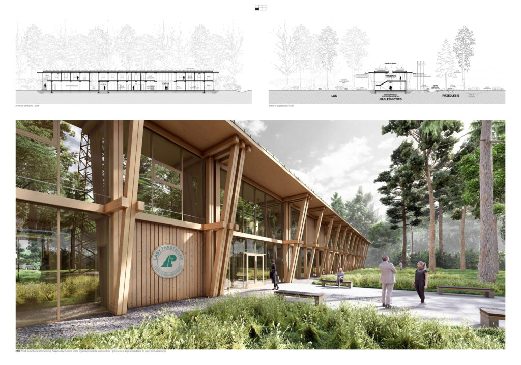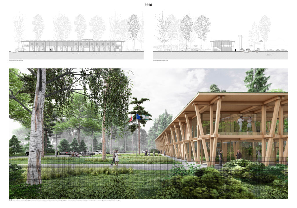 Forma budynku wynika z logiki konstrukcji i jego lokalizacji. Linearna bryła, niemal wyznaczająca granicę lasu, pozostawia przedpole od strony wschodniej – przestrzeń otwartą dla odwiedzających, z funkcją edukacyjną i reprezentacyjną. Drewniany szkielet, eksponowany zarówno wewnątrz, jak i na elewacji, podkreśla ekonomikę konstrukcji, której rytm nawiązuje do pionowego układu pni drzew w lesie. Transparentność fasad sprawia, że budynek nie dominuje nad otoczeniem, lecz wtapia się w krajobraz, pozwalając naturze przenikać do wnętrza. Powtarzalność modułów konstrukcyjnych nie tylko nadaje obiektowi spójność, ale również minimalizuje ślad węglowy poprzez ograniczenie odpadów i optymalizację procesów budowlanych. Naturalne materiały, takie jak drewno i szkło, nadają budynkowi lekkość i ciepło, a jednocześnie podkreślają jego ekologiczny charakter.