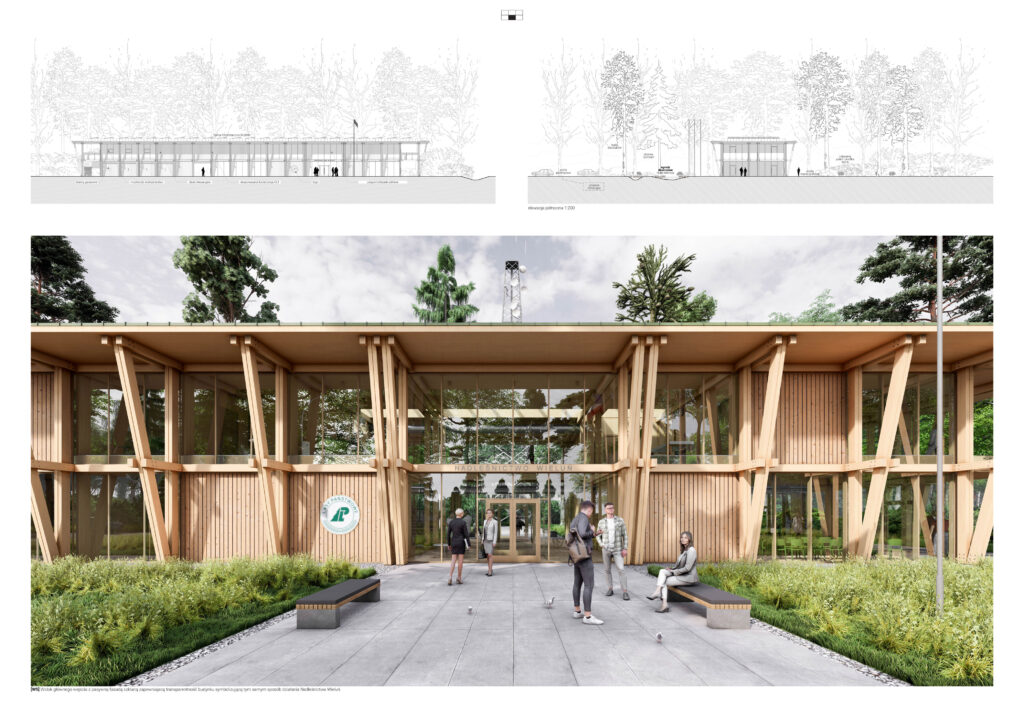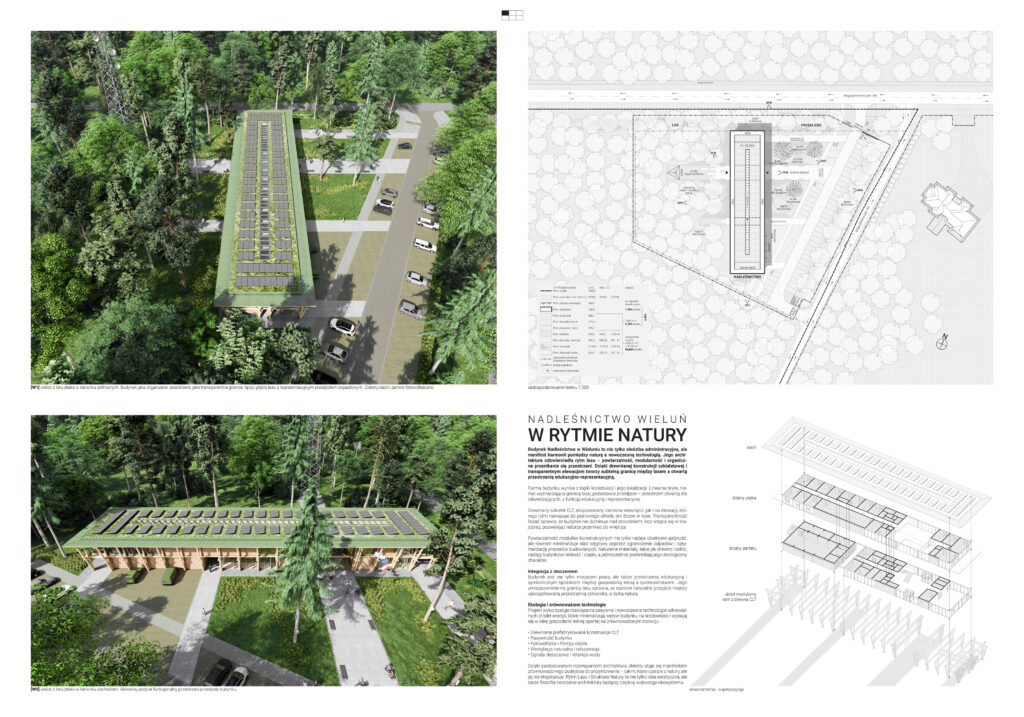 Budynek Nadleśnictwa w Wieluniu to nie tylko siedziba administracyjna, ale także manifest harmonii pomiędzy naturą a nowoczesną technologią. Jego architektura odzwierciedla rytm lasu – powtarzalność, modularność i organiczne przenikanie się przestrzeni. Dzięki drewnianej konstrukcji szkieletowej i transparentnym elewacjom tworzy subtelną granicę między lasem a wewnętrznymi przestrzeniami pracy.