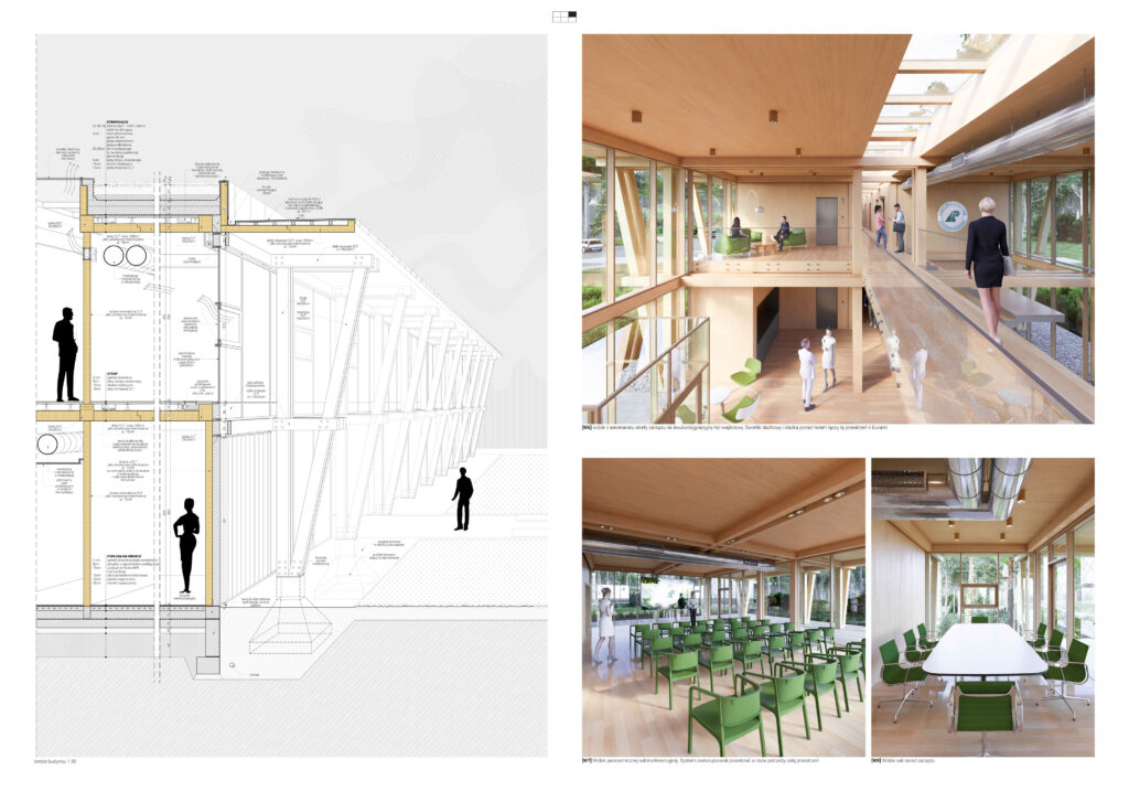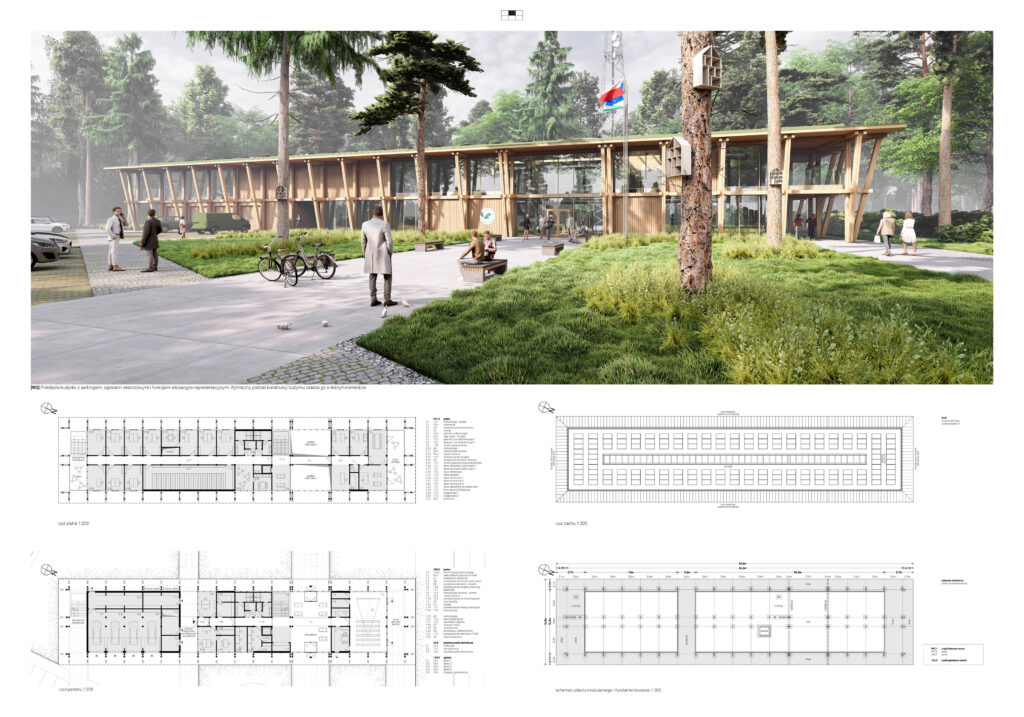 Projekt wykorzystuje rozwiązania pasywne i nowoczesne technologie odnawialnych źródeł energii, które minimalizują wpływ budynku na środowisko i wpisują się w ideę gospodarki leśnej opartej na zrównoważonym rozwoju.
